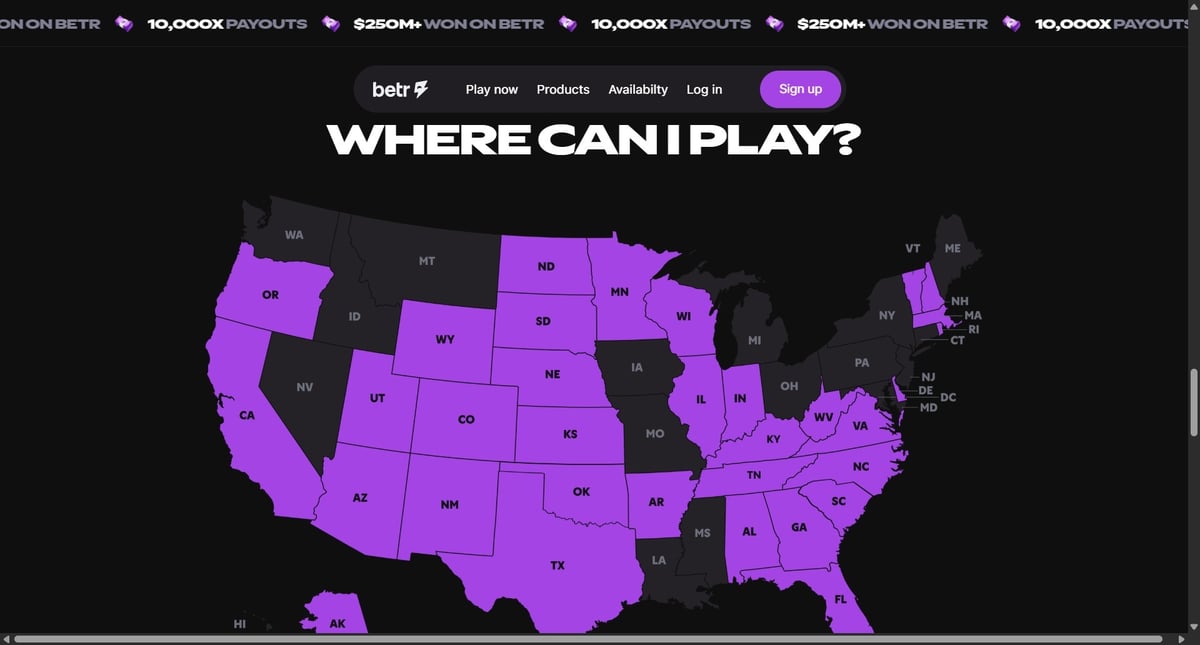 Betr Casino is legal in most US states under sweepstake laws. A few states restrict sweepstake platforms, including Washington and Michigan. Some states only allow social-style play. Always check your local sweepstake regulations before playing.