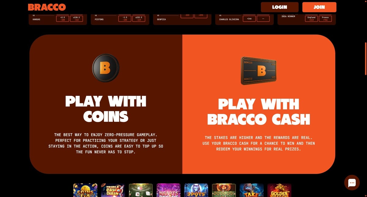 Bracco operates under the sweepstakes model, meaning real-money wagering doesn’t occur directly. Instead, players use virtual currencies — one for entertainment and one for prize-eligible play — to enjoy both casino games and sports predictions.