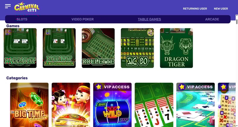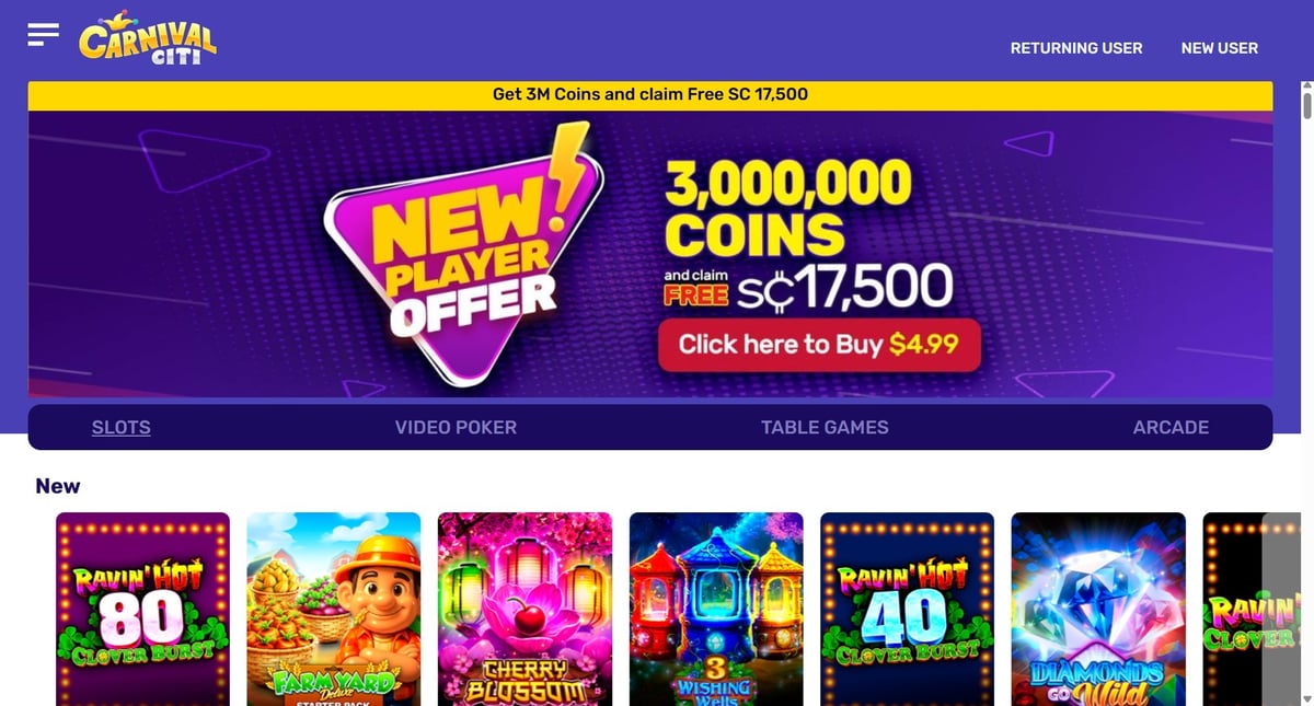 Carnival Citi consistently rotates a wide mix of promotions designed to appeal to repeat players, casual users, and sweepers looking for value.