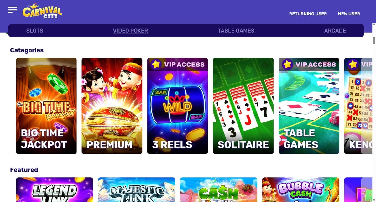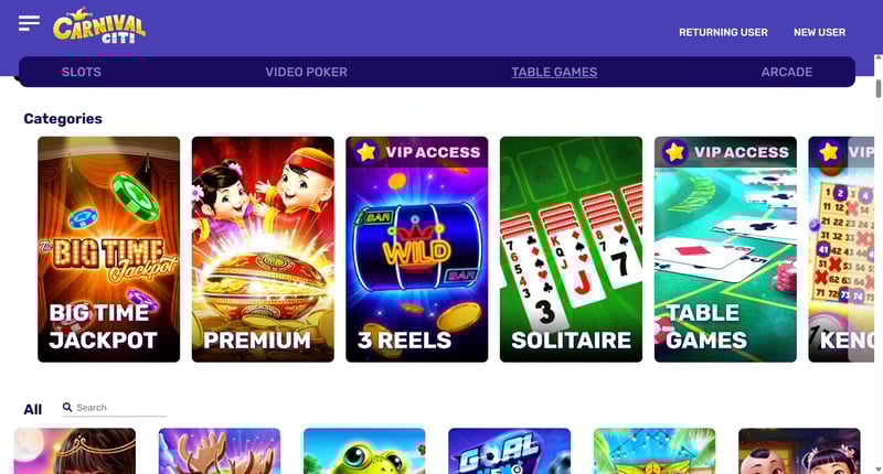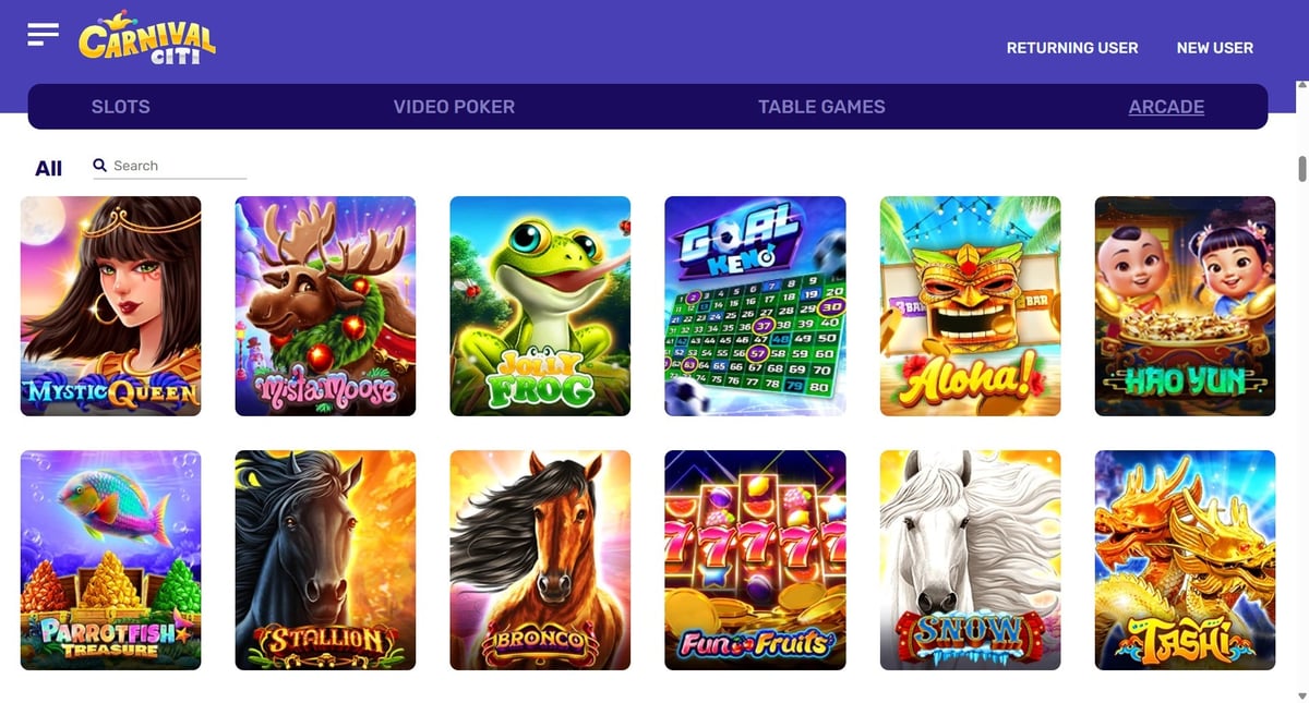 Carnival Citi features slots, crash games, fish shooter games, instant wins, and arcade-style titles. Game variety appeals to casual players and sweeps fans who enjoy fast-paced and visually engaging options.