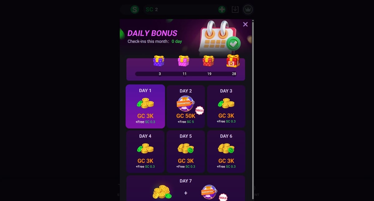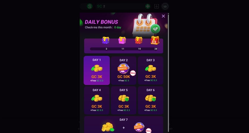 | Daily Login Bonus | Free GC + small SC amounts |