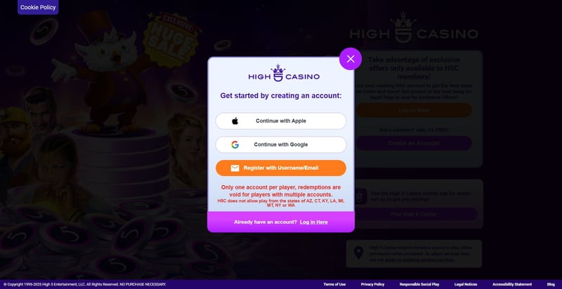High 5 Casino’s registration process is quick and user-friendly, making it easy for beginners and experienced players to get started. Here’s how to join and begin playing with Gold Coins or Sweeps Coins.