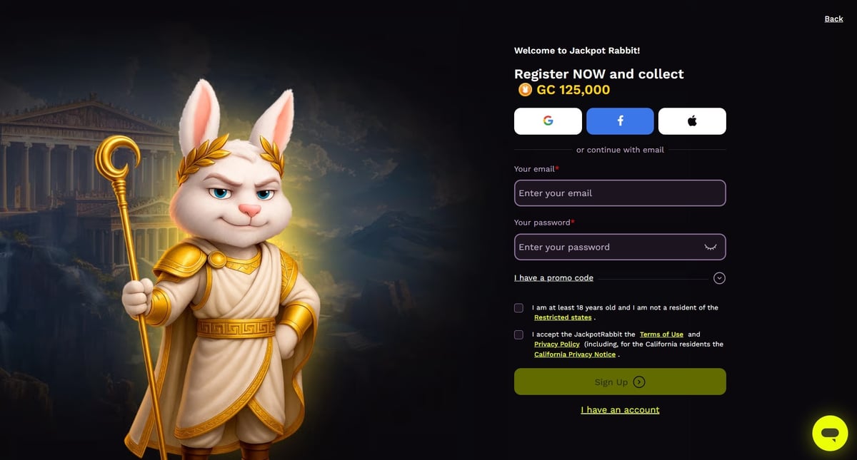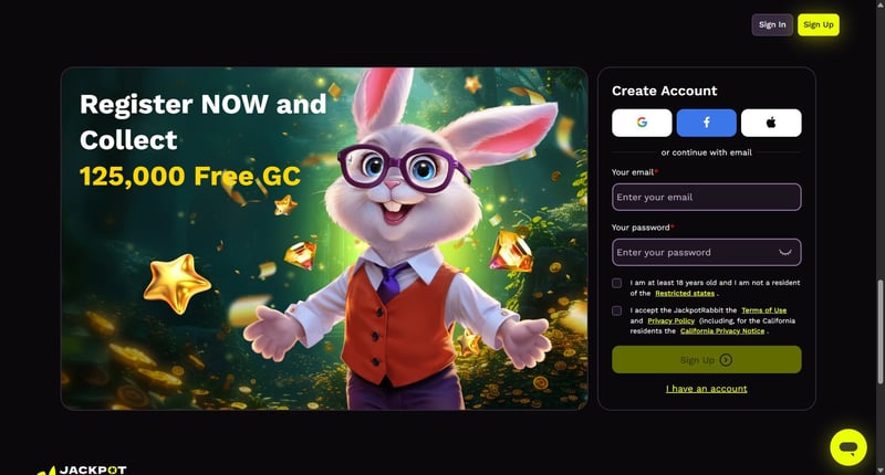 Head to JackpotRabbit.com and click “Sign Up.” - Create your account