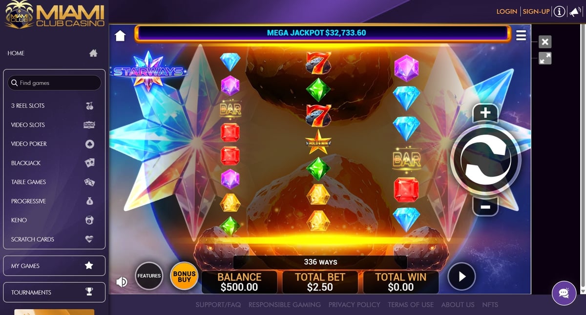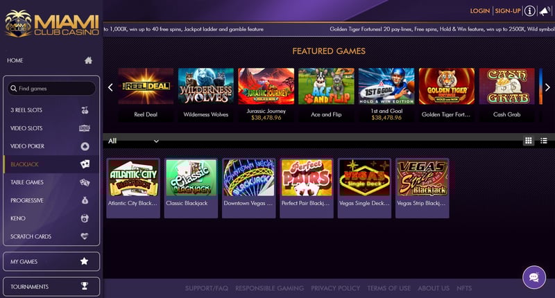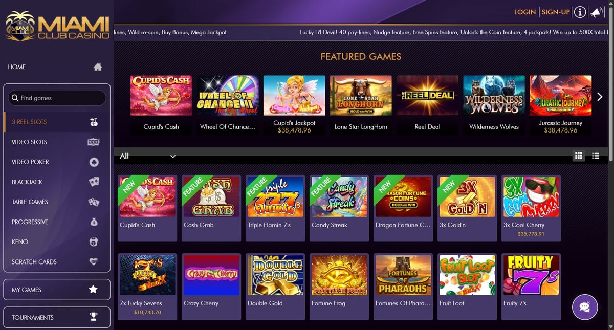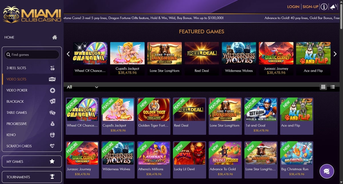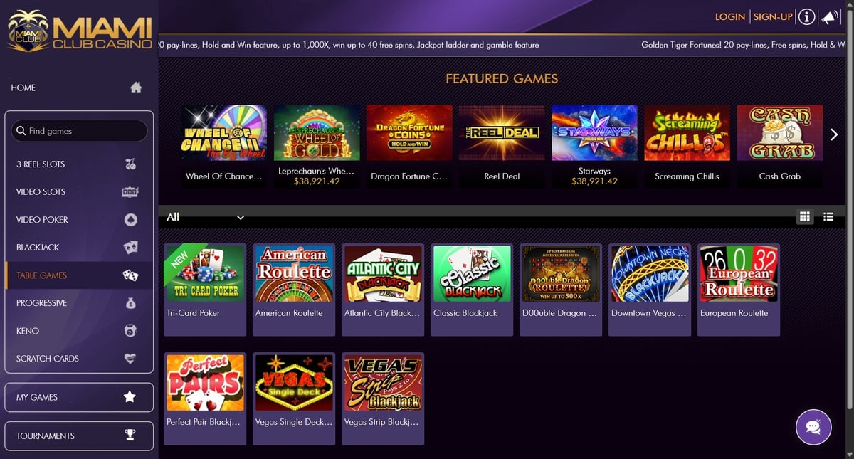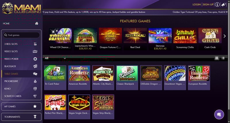 Miami Club Casino focuses heavily on slots, alongside a smaller selection of table games and video poker, mainly powered by WGS Technology.