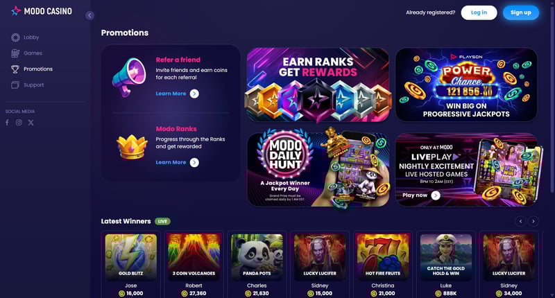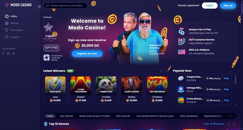 Modo.US regularly runs promotions designed to reward both new and existing players. These bonuses usually focus on free-play coins, promotional sweepstakes entries, or loyalty-style rewards rather than traditional deposit bonuses.