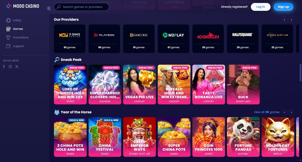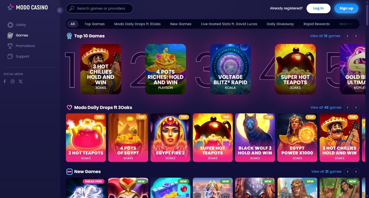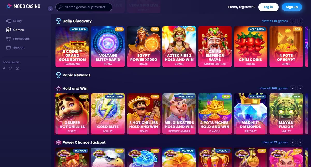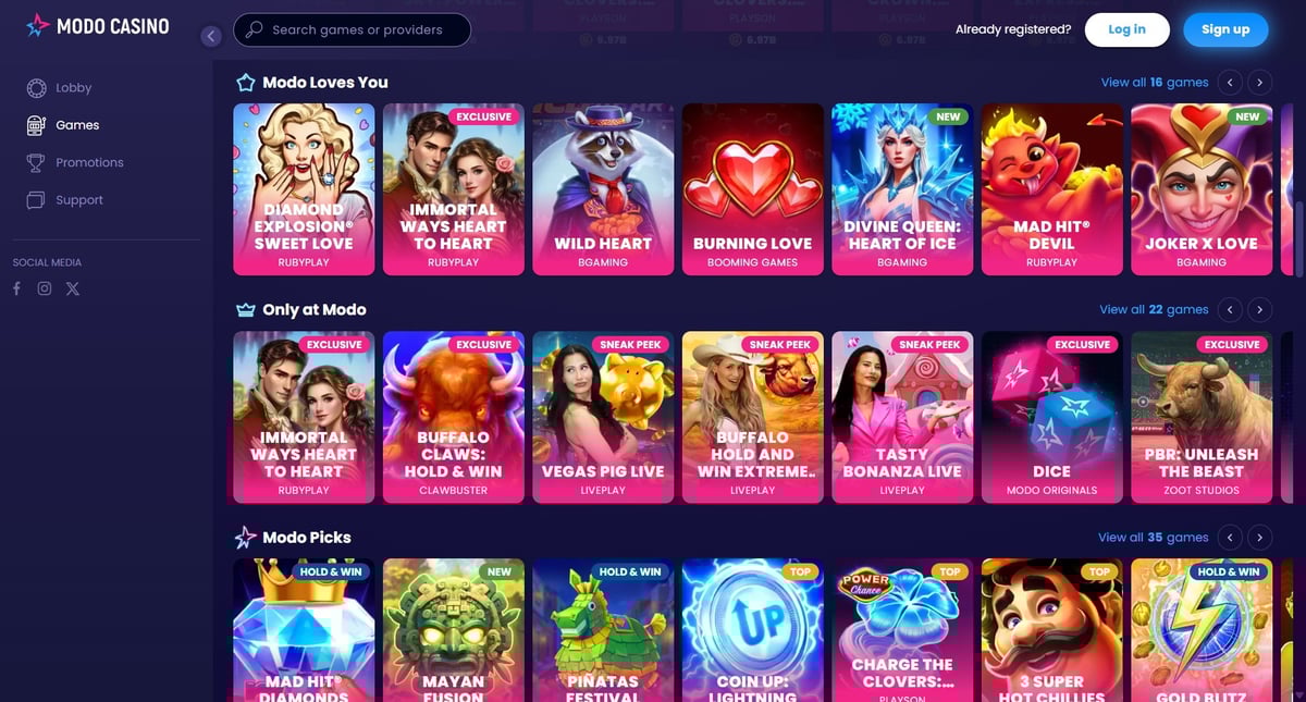 The Modo.US website is modern, responsive, and well-optimized for mobile play. Navigation is intuitive, with games loading quickly across most devices. Menus are clearly labeled, and players can easily track coin balances and promotions.