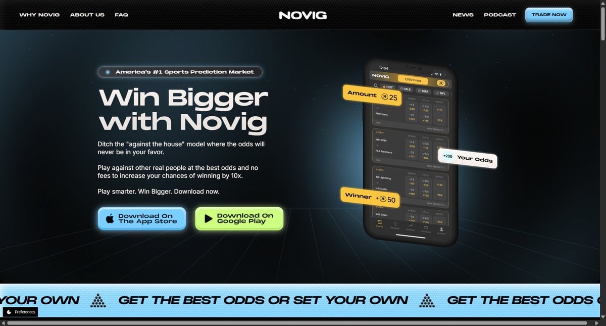 Novig is a U.S.-based social sportsbook that lets users make predictions on major sports leagues using a dual-currency system: Novig Coins (for free play) and Novig Cash (redeemable for prizes after meeting conditions). The platform emphasizes an intuitive mobile app, commission-free betting, and innovative features such as setting your own odds.