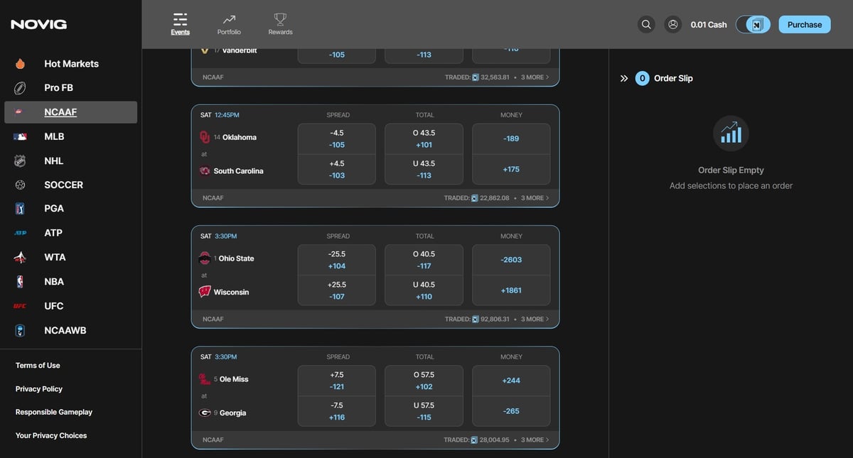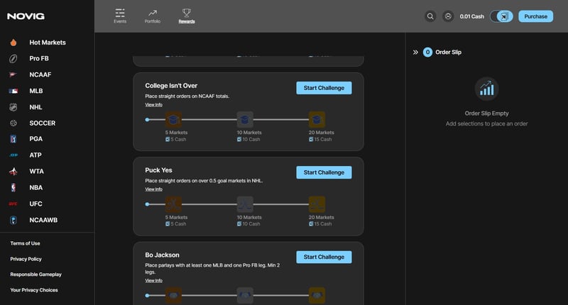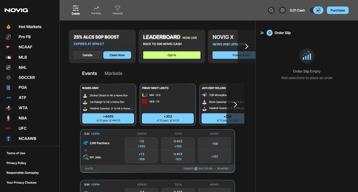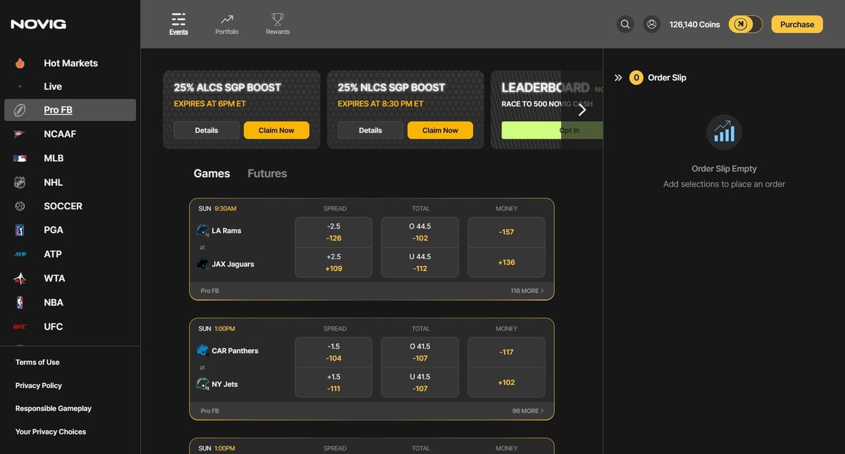 Start Playing: Use your Novig Coins to place predictions on NFL, NBA, MLB, and other leagues.