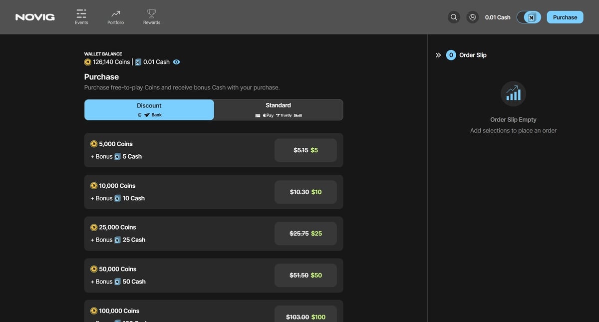 Claim Welcome Bonus: Youβll receive Novig Coins automatically upon signup and may unlock additional Novig Cash after your first coin purchase.