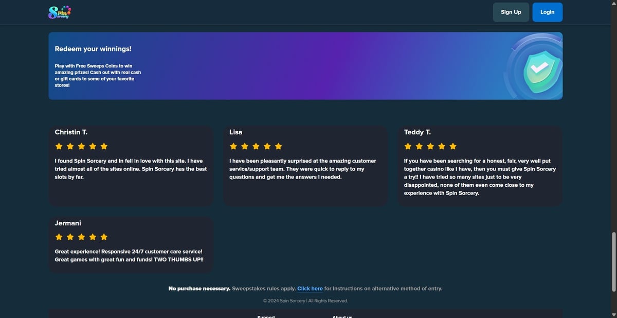 Yes. Spinsorcery uses a sweepstakes-style system where Sorcery Coins can be redeemed for real rewards once redemption requirements are met. Gold Coins are strictly for entertainment play.